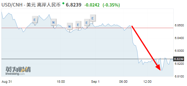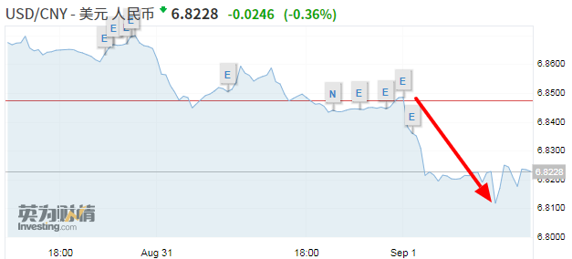 9月的第一天,人民幣中間價報6.8498,上調(diào)107點。盤中離岸、在岸人民幣繼續(xù)高歌猛進,接連突破6.84、6.83、6.82關(guān)口,截至16:30,離岸人民幣匯率最高觸及6.8135,在岸人民幣最高觸及6.8118。