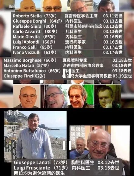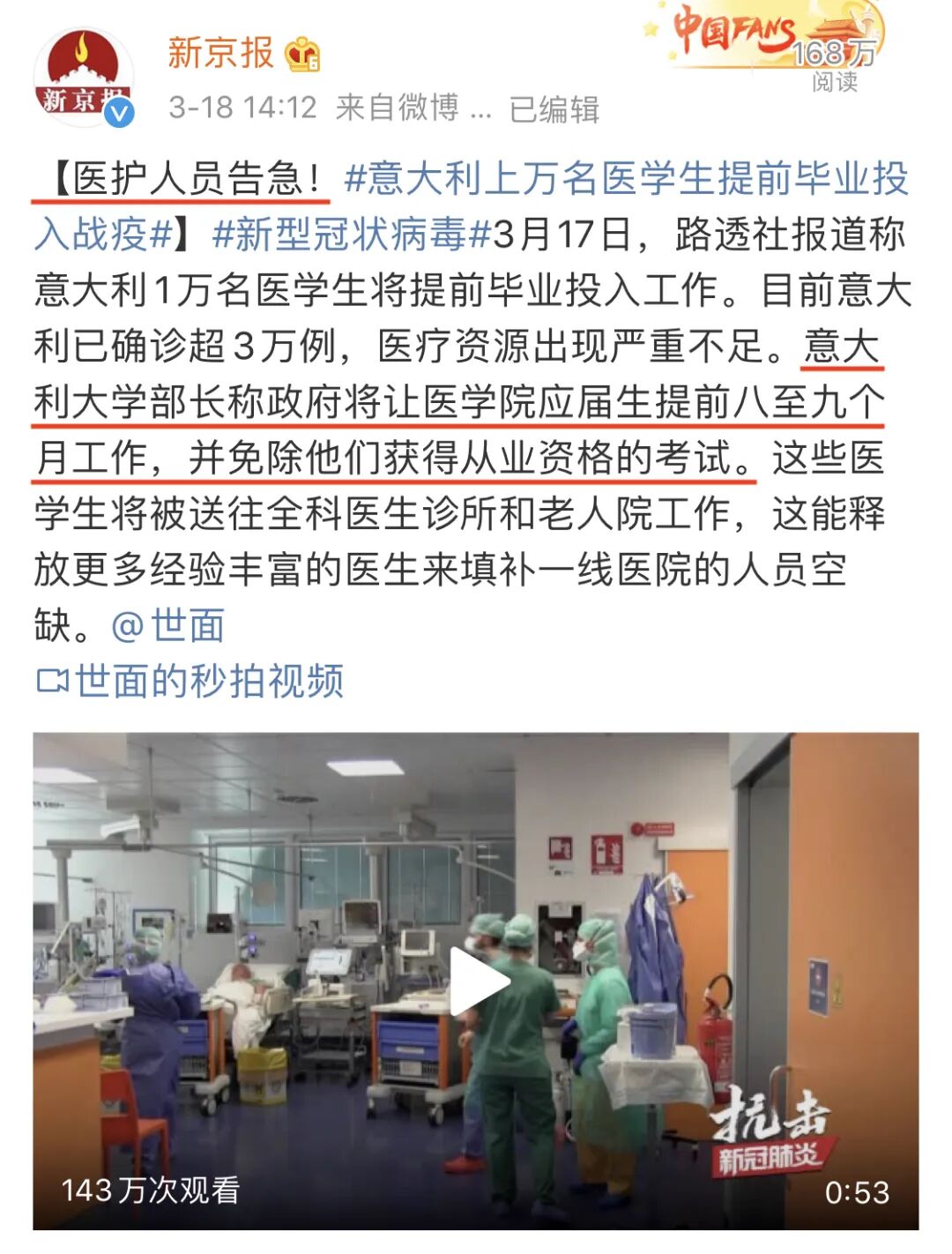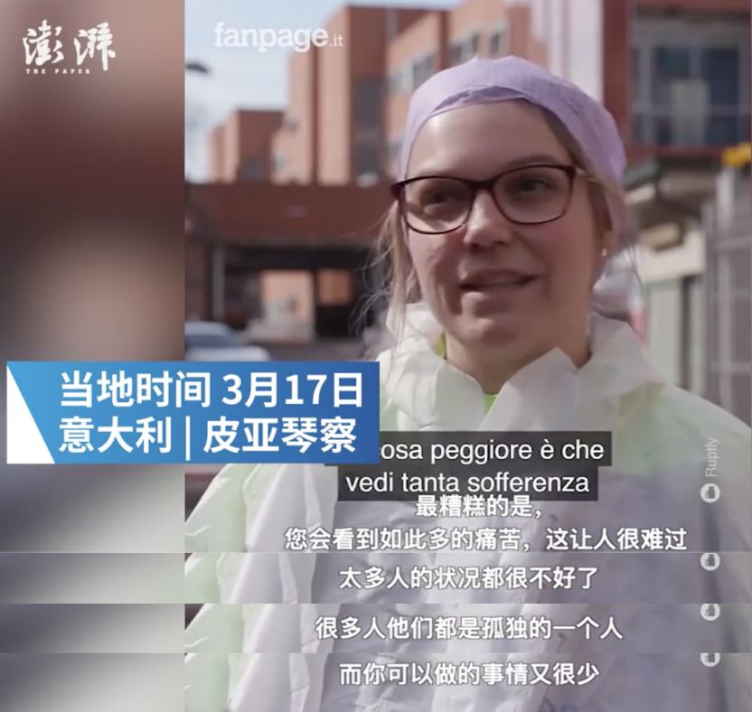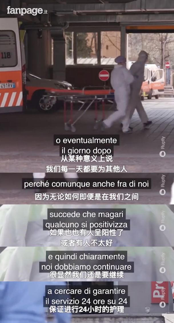 這樣的疫情之下 意大利的醫(yī)療資源已經(jīng)全線告急 實在是沒辦法了... 意大利政府只好決定 1萬名醫(yī)學生直接提前畢業(yè)投入工作 不止是還未正式畢業(yè)的醫(yī)學生 還有已經(jīng)退休的醫(yī)護們能返崗就返崗 一起加入戰(zhàn)斗 一名已經(jīng)85歲的威尼斯麻醉師 Giampiero Giron 在這場疫情中又重新投入了工作 當你決定做一名醫(yī)生時, 你就把自己置于危險之中了,我為此發(fā)過誓。 害怕疾病?那你最好不要當醫(yī)生?!?/p> 而那些還沒有正式畢業(yè)的醫(yī)護人員上崗之后 被前線的狀況給震驚到了! 意大利倫巴第大區(qū)有實行“戰(zhàn)時分診原則” 就是先救大概率能救活的 年紀太大或者病情太重、回天乏力的 就會在還活著的時候,直接放棄 這位沒有正式畢業(yè)的醫(yī)護人員 第一次摘掉活人的氧氣罩時,心如刀割 但也是沒有辦法 只能在這樣負罪感深重的工作中漸漸崩潰... 看得讓人不知道說什么好... 殘酷又絕望 但意大利的醫(yī)護人員也只能這樣繼續(xù)堅持著 3月19日 倫巴第大區(qū)貝加莫市醫(yī)院的一位麻醉師 接受采訪說: “我這輩子還從沒有過這么大的壓力” 意大利疫情最嚴重的地區(qū)是倫巴第大區(qū) 貝加莫可以說是大區(qū)內最嚴重的城市之一 這座小城僅有12萬人口 目前已確診超4350例 這位麻醉師所在醫(yī)院有100位麻醉師 就算是已經(jīng)全員上崗且盡全力 還是應付不過來醫(yī)院里的情況 3月17日 意大利皮亞琴察一名急診室護士 在接受采訪時落淚 她表示從來沒有見過如此多的痛苦 目前意大利的確診人數(shù)還在激增 醫(yī)院一床難求 有人在醫(yī)院里等一個床位等了好幾天 這位護士還說,即使身邊有醫(yī)護倒下了 她們也不能停止戰(zhàn)斗 還是要保證24小時的護理工作 看到意大利這樣的情況 我們國家派出了醫(yī)療隊前往支援意大利 雖然人數(shù)不多 但是我們的醫(yī)療隊是帶著 兩個月以來的新冠肺炎治療經(jīng)驗去的 3月18日 當東航的飛機載著醫(yī)療隊和物資降落米蘭 米蘭塔臺當即表示感謝 這邊中國機組回答: 加油意大利,堅持住 照顧好我們的醫(yī)生,中意友誼長存 蠻感動的,畢竟人類命運共同體了 現(xiàn)在誰都不容易 我們國內已經(jīng)好多了,還有了治療經(jīng)驗 就幫幫困難的別人家 然而當中國醫(yī)療隊進到意大利的醫(yī)院 我們看到這樣的畫面 中國醫(yī)療隊是全方位保護好了自己 但是意大利的醫(yī)生們這個防護不行啊?。?! 在意大利這樣嚴峻的疫情之下 源源不斷的人涌進醫(yī)院 意大利的醫(yī)院都已經(jīng)滿負荷運轉了 可是在被曝光的意大利醫(yī)院畫面里 醫(yī)生的口罩和手套是都帶著了 可是口罩也不全都是N95標準的 眼部防護有的醫(yī)護有,有的醫(yī)護沒 防護服是更加不提了 畫面里沒看到有醫(yī)護穿 我們的醫(yī)護穿的那種封閉式的 他們都只有薄薄一層藍色防護套衫 并不封閉,也就無效 昨天(3月22日) 第二批中國援意大利抗疫醫(yī)療專家組組長 在接受采訪時表示 目前意大利醫(yī)生對這個疾病的認識不夠 也就導致了醫(yī)院里的隔離措施不到位 進一步也就導致了 “院內感染” “交叉感染”嚴重存在 換句話說,意大利的醫(yī)院 也成了一個產(chǎn)生疾病的地方... 大概也就是因為 醫(yī)院里隔離和防護工作的不到位 意大利目前共有2629名醫(yī)務工作者感染 其中有80歲高齡的醫(yī)生 也有退休返崗的醫(yī)生... 而意大利的疫情控制困難重重 不管是醫(yī)療資源,還是普通民眾的出行 都很成問題 雖然我們和意大利的國情不同 但意大利到現(xiàn)在還沒有看到峰值和好轉 反而醫(yī)院里的醫(yī)護們都要崩潰了 替呆梨擔心... ?? △ 3月19日意大利LA7電視臺播放的新聞記錄短片畫面 2020年 整個世界都已經(jīng)被這個病毒給改變了... 希望意大利的醫(yī)院能夠做好隔離分區(qū) 醫(yī)護們能夠做足防護 民眾們能夠減少出門 逐漸切斷傳染,慢慢好起來 不然光靠醫(yī)護們 在醫(yī)院里搏命是沒有用的??! △ 意大利圣瑪麗亞醫(yī)院門前的一張寫字板,用歪歪扭扭的意大利語和中文寫道:“醫(yī)生和護士,現(xiàn)世英雄,沒有詩人來訴訟你們的英勇事跡,忠(衷)心的感謝”。