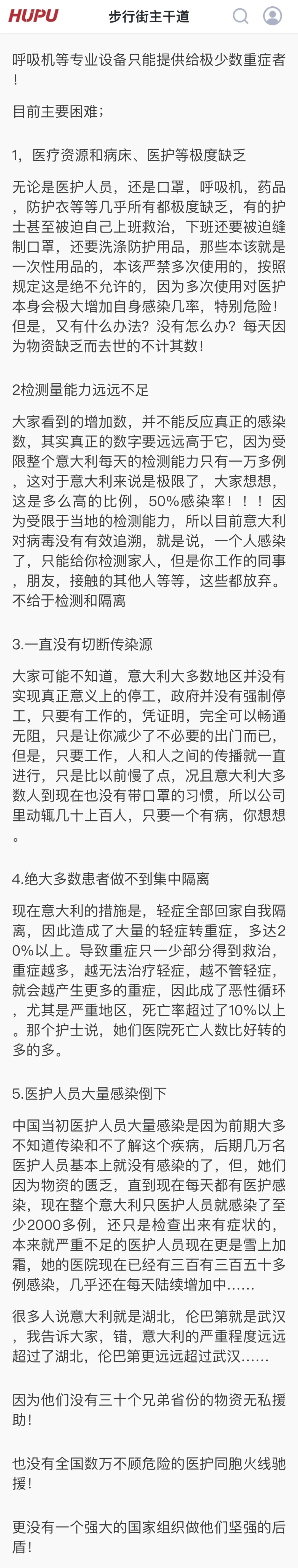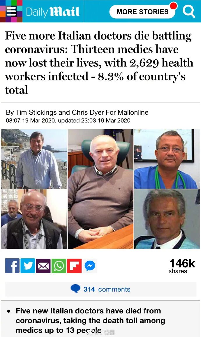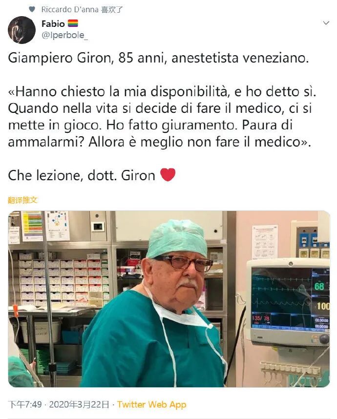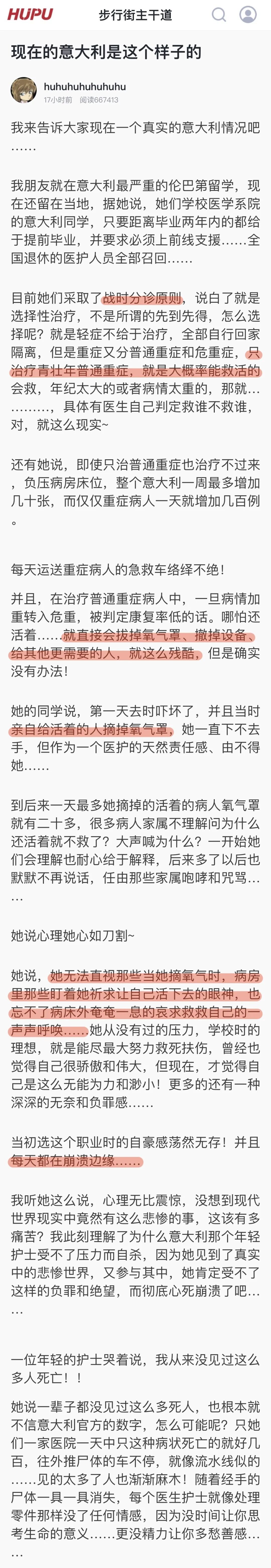 這樣的疫情之下 意大利的醫(yī)療資源已經(jīng)全線告急 實在是沒辦法了... 意大利政府只好決定 1萬名醫(yī)學生直接提前畢業(yè)投入工作 不止是還未正式畢業(yè)的醫(yī)學生 還有已經(jīng)退休的醫(yī)護們能返崗就返崗 一起加入戰(zhàn)斗 一名已經(jīng)85歲的威尼斯麻醉師 Giampiero Giron 在這場疫情中又重新投入了工作 當你決定做一名醫(yī)生時, 你就把自己置于危險之中了,我為此發(fā)過誓。 害怕疾病?那你最好不要當醫(yī)生?!?/p> 而那些還沒有正式畢業(yè)的醫(yī)護人員上崗之后 被前線的狀況給震驚到了! 意大利倫巴第大區(qū)有實行“戰(zhàn)時分診原則” 就是先救大概率能救活的 年紀太大或者病情太重、回天乏力的 就會在還活著的時候,直接放棄 這位沒有正式畢業(yè)的醫(yī)護人員 第一次摘掉活人的氧氣罩時,心如刀割 但也是沒有辦法 只能在這樣負罪感深重的工作中漸漸崩潰... 看得讓人不知道說什么好... 殘酷又絕望 但意大利的醫(yī)護人員也只能這樣繼續(xù)堅持著 3月19日 倫巴第大區(qū)貝加莫市醫(yī)院的一位麻醉師 接受采訪說: “我這輩子還從沒有過這么大的壓力” 意大利疫情最嚴重的地區(qū)是倫巴第大區(qū) 貝加莫可以說是大區(qū)內最嚴重的城市之一 這座小城僅有12萬人口 目前已確診超4350例 這位麻醉師所在醫(yī)院有100位麻醉師 就算是已經(jīng)全員上崗且盡全力 還是應付不過來醫(yī)院里的情況 3月17日 意大利皮亞琴察一名急診室護士 在接受采訪時落淚 她表示從來沒有見過如此多的痛苦 目前意大利的確診人數(shù)還在激增 醫(yī)院一床難求 有人在醫(yī)院里等一個床位等了好幾天 這位護士還說,即使身邊有醫(yī)護倒下了 她們也不能停止戰(zhàn)斗 還是要保證24小時的護理工作 看到意大利這樣的情況 我們國家派出了醫(yī)療隊前往支援意大利 雖然人數(shù)不多 但是我們的醫(yī)療隊是帶著 兩個月以來的新冠肺炎治療經(jīng)驗去的 3月18日 當東航的飛機載著醫(yī)療隊和物資降落米蘭 米蘭塔臺當即表示感謝 這邊中國機組回答: 加油意大利,堅持住 照顧好我們的醫(yī)生,中意友誼長存 蠻感動的,畢竟人類命運共同體了 現(xiàn)在誰都不容易 我們國內已經(jīng)好多了,還有了治療經(jīng)驗 就幫幫困難的別人家 然而當中國醫(yī)療隊進到意大利的醫(yī)院 我們看到這樣的畫面 中國醫(yī)療隊是全方位保護好了自己 但是意大利的醫(yī)生們這個防護不行啊?。?! 在意大利這樣嚴峻的疫情之下 源源不斷的人涌進醫(yī)院 意大利的醫(yī)院都已經(jīng)滿負荷運轉了 可是在被曝光的意大利醫(yī)院畫面里 醫(yī)生的口罩和手套是都帶著了 可是口罩也不全都是N95標準的 眼部防護有的醫(yī)護有,有的醫(yī)護沒 防護服是更加不提了 畫面里沒看到有醫(yī)護穿 我們的醫(yī)護穿的那種封閉式的 他們都只有薄薄一層藍色防護套衫 并不封閉,也就無效 昨天(3月22日) 第二批中國援意大利抗疫醫(yī)療專家組組長 在接受采訪時表示 目前意大利醫(yī)生對這個疾病的認識不夠 也就導致了醫(yī)院里的隔離措施不到位 進一步也就導致了 “院內感染” “交叉感染”嚴重存在 換句話說,意大利的醫(yī)院 也成了一個產(chǎn)生疾病的地方... 大概也就是因為 醫(yī)院里隔離和防護工作的不到位 意大利目前共有2629名醫(yī)務工作者感染 其中有80歲高齡的醫(yī)生 也有退休返崗的醫(yī)生... 而意大利的疫情控制困難重重 不管是醫(yī)療資源,還是普通民眾的出行 都很成問題 雖然我們和意大利的國情不同 但意大利到現(xiàn)在還沒有看到峰值和好轉 反而醫(yī)院里的醫(yī)護們都要崩潰了 替呆梨擔心... ?? △ 3月19日意大利LA7電視臺播放的新聞記錄短片畫面 2020年 整個世界都已經(jīng)被這個病毒給改變了... 希望意大利的醫(yī)院能夠做好隔離分區(qū) 醫(yī)護們能夠做足防護 民眾們能夠減少出門 逐漸切斷傳染,慢慢好起來 不然光靠醫(yī)護們 在醫(yī)院里搏命是沒有用的??! △ 意大利圣瑪麗亞醫(yī)院門前的一張寫字板,用歪歪扭扭的意大利語和中文寫道:“醫(yī)生和護士,現(xiàn)世英雄,沒有詩人來訴訟你們的英勇事跡,忠(衷)心的感謝”。