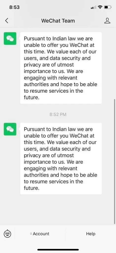 微信在給用戶的通知中稱,“根據(jù)印度法律,我們目前無法為您提供微信服務。我們重視每一位用戶,數(shù)據(jù)安全和隱私對我們來說是最重要的。我們正在與相關部門接觸,希望未來能夠恢復服務。”